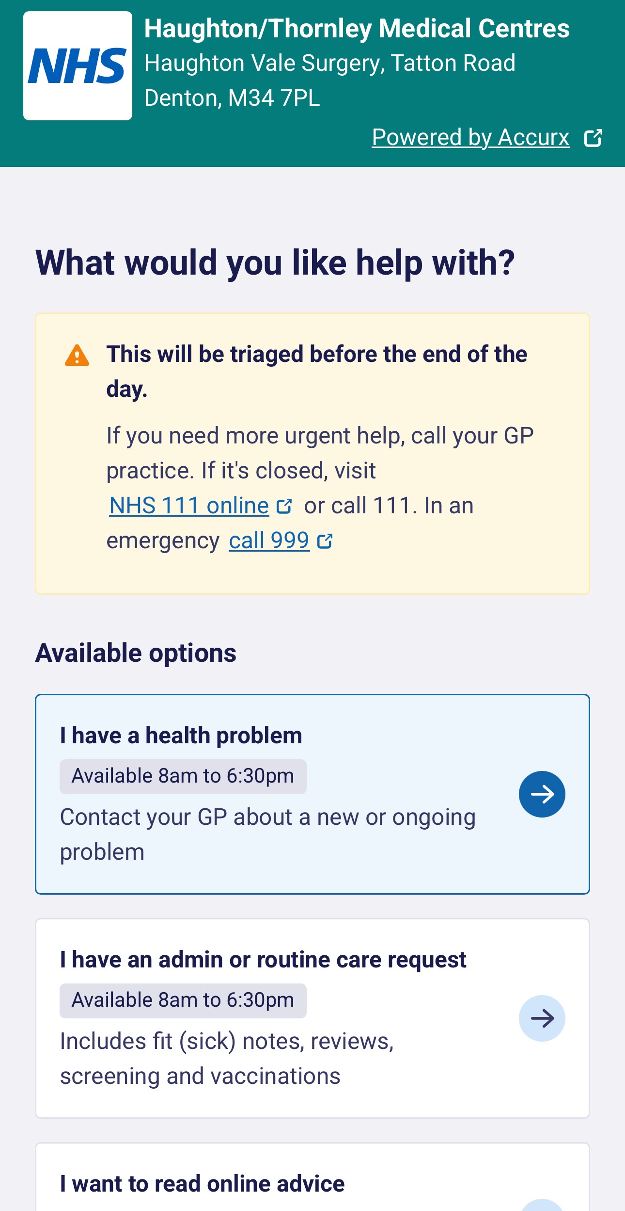 We operate a modern triage system which tries to cater for your needs. We ask all patients who need to book an appointment to go online between 8am and 6:30pm Monday to Friday or phone the surgery and leave a message with the receptionist with a brief description of what the problem is. We will deal with the information confidentially and inform the doctor.